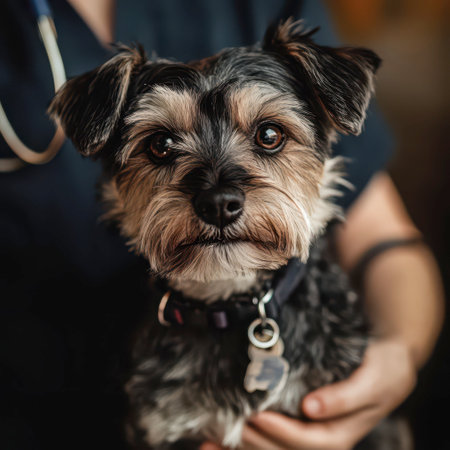 A small dog with a distinctive coat is being lovingly held by a caregiver. The setting suggests a warm indoor environment, highlighting their bond and the dog's charming expression.