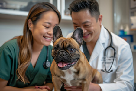 .Happy interaction at the vet with a smiling dog and joyful people, showing positive animal care.