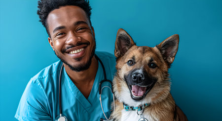 Smiling veterinarian hugging a happy dog on a blue background.