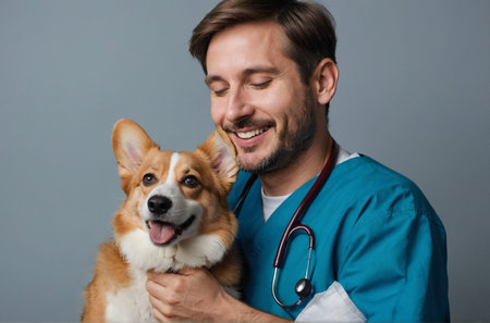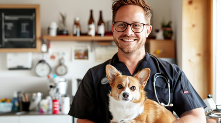 Veterinarian Holds Adorable Corgi Dog, Smiling at Camera in a Modern Clinic Environment