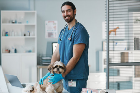 Young male veterinary doctor in uniform and gloves standing by medical table with yorkshire terrier and looking at camera during check up