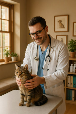Veterinarian smiling while gently examining a tabby cat on an examination table in a bright veterinary clinic