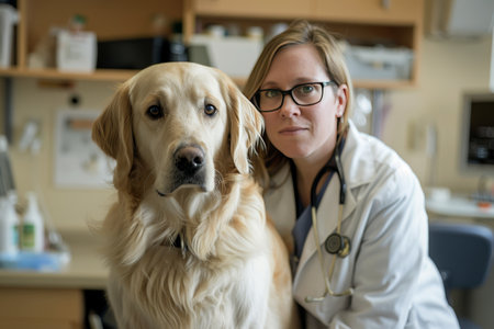 Veterinarian is caring for a golden retriever in a modern clinic, highlighting the bond between animals and their caregivers in a comforting atmosphere