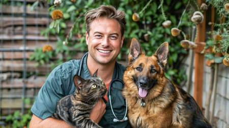 Veterinarian Posing with Happy Cat and Dog Patients, Smiling at Camera, in Lush Garden