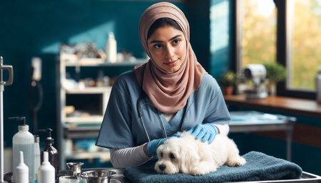 photorealistic image of a female Middle Eastern veterinarian in a clinic, attentively treating an animal.