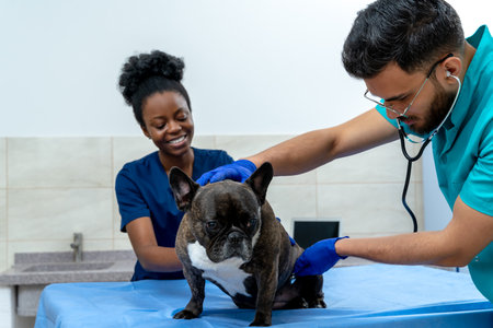 In a clinical setting, a veterinarian is conducting a thorough physical examination on a dog, highlighting the importance of animal health, professional care, and veterinary medicine.