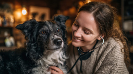 A veterinarian gently comforts a nervous dog during an examination in a cozy clinic. The atmosphere is warm and reassuring, creating a bond of trust between them.