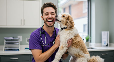 Happy veterinarian with dog licking his face. Veterinary professional with pet in clinic. Animal care and health concept.