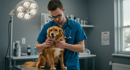 Veterinarian in blue scrubs is gently examining golden retriever dog in a modern clinic, highlighting the caring relationship between animal and professional