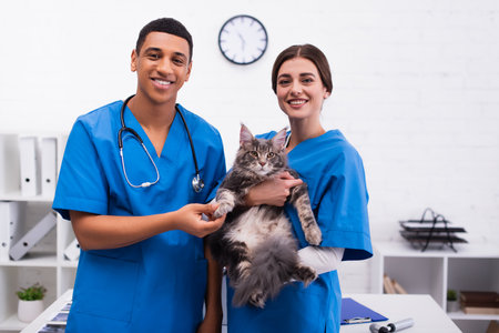 Cheerful multiethnic veterinarians in uniform holding maine coon in clinic