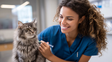 Young woman with cat visiting vet clinic and having consultation with vet doctor