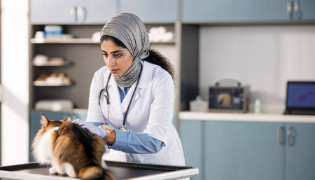 Beautiful disgruntled cat at a routine examination by a veterinarian. Cat in a veterinary clinic. Professional diagnostics. Pet health.