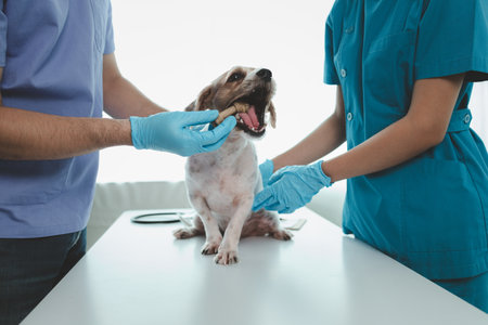 Veterinarian cares for a dog during a routine checkup in a clinic