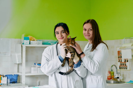 Two Female Veterinarians Care For Cat In Bright Green Clinic, Professional Pet Health Team Working