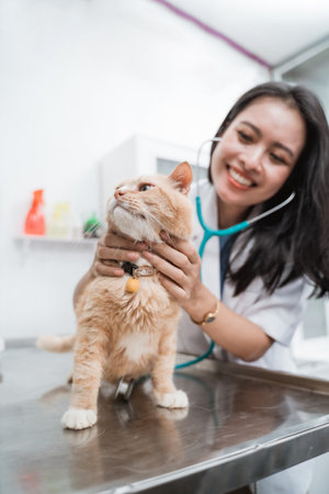 the veterinarian listens with a statoscope to the cat lying on the table, physical examination of pets, animal health Concept