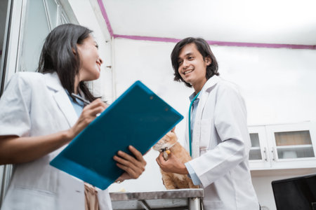 Close up two veterinary doctor analyzing medical tests of cat in clinic