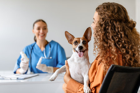 Veterinarian talking to joyful female dog owner during appointment in clinic