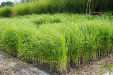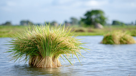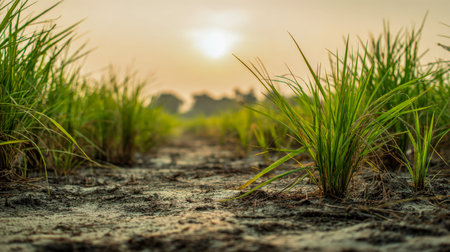Rows of vibrant green rice plants grow abundantly in fertile fields illuminated by the warm glow of midday sunlight.