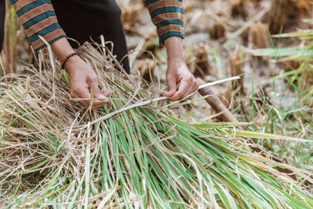 close up of farmers hands tying rice plants after harvesting