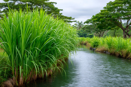 Sugarcane plants thriving by a water canal under a cloudy sky