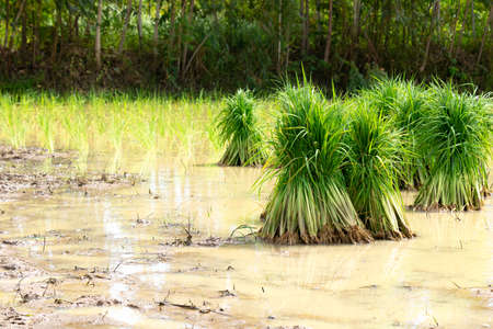Rice seedlings growing on a paddy field in Thailand.