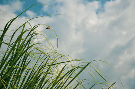 Beautiful wind wept green grasses and dragonfly flying behind the grasses against the white cloudy sky