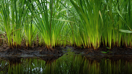 A panoramic wide view of Papyrus pond growing closely together after rain wet leaves reflecting soft light fresh soil visible ultra realistic photography cinematic wide composition lifelike natural scene