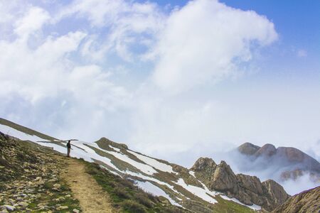 Route through mountain peaks and hills through majestic landscapes. Active tourists, hiking, Caucasus Mountains Oshten Fisht. Sport lifestyle concept