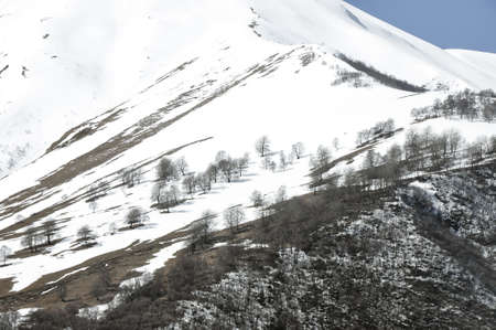 Mountain landscape with snow and clear blue sky. Caucasus Mountains, Georgia, region Gudauri.