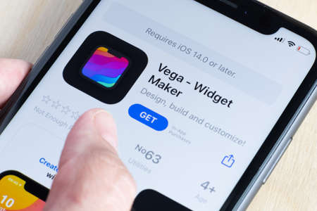Vega Maker - Widget app icon on Apple iPhone screen close-up. Vega Maker - Widget app icon. Vega Maker - Widget application.