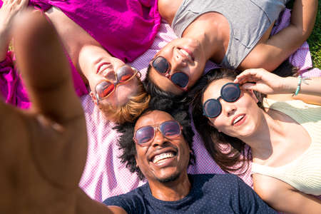 Seflie photo of a group of multiethnic friends laying in the grass on a sunny day in a park.