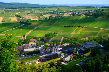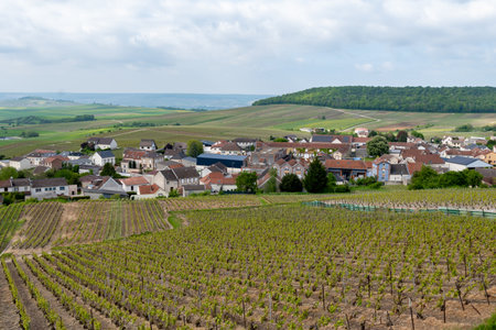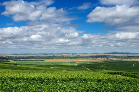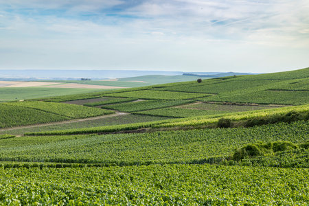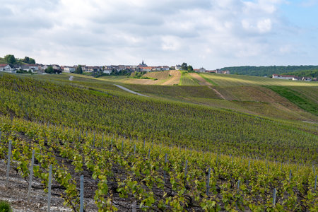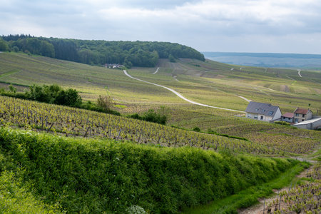 Spring landscape with green grand cru vineyards near Cramant, Avize region Champagne, France. Cultivation of white chardonnay wine grape on chalky soils of Cote des Blancs.