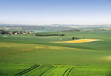 Reims, France, May 14, 2025. Champagne landscape near the city of Reims in France. In spring, the cereal fields in the Champagne plain begin to grow and cover the horizon with an intense green.