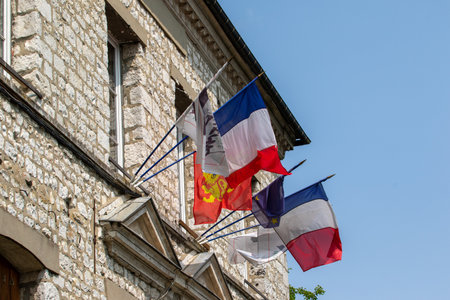 Flags hang from a stone building against a blue sky. The flags include the French flag and others with regional symbols in Giverny, France.