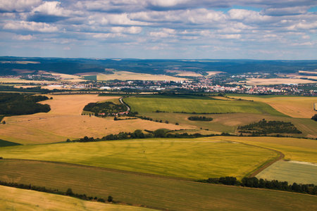 Landcsape with green sunny meadows and fields and town in the background from a bird's eye perspective