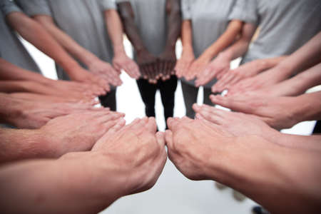 Top view of diverse multiracial colleagues join hands engaged in teambuilding activity. Multiethnic employees or workers show diversity at workplace. Coworkers motivated for shared result.