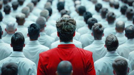 HR headhunting, crowd of whitetied businessmen with one in red, leadership choice