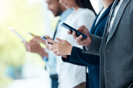 None of us is as smart as all of us. a group of unrecognizable businesspeople using their devices in a modern office.