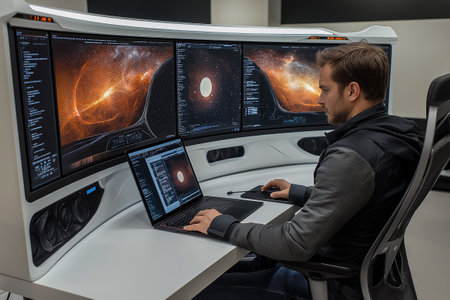 Meteorologist monitoring weather forecast at monitor screen. Workplace in meteorological department. Created with Generative AI