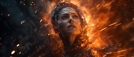 3d rendering of female cyborg head with circuit board on dark background