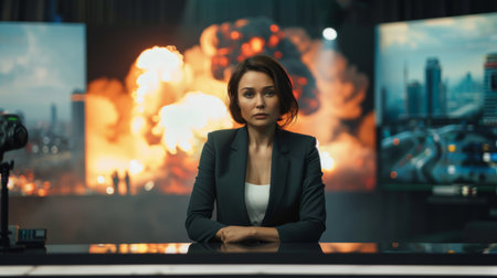News Anchor Reporting on Industrial Catastrophe, A composed news anchor stands ready to report in a studio, with dramatic visuals of an industrial explosion in the background.