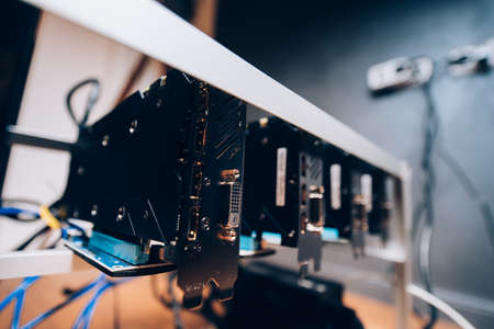 close up details of modern graphics cards mining rig used for creating bitcoin digital currency