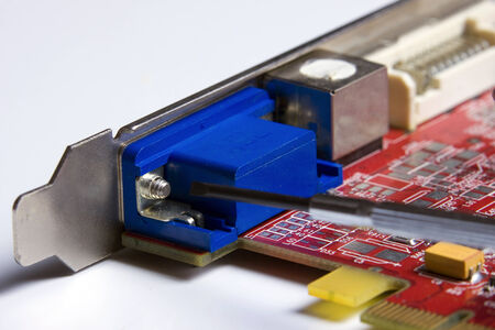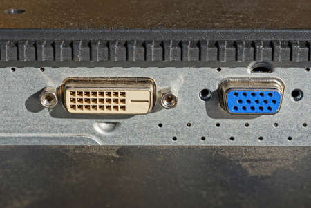Graphics card connectors. The place to connect the signal cable transmitting the image to the monitor. Light background.