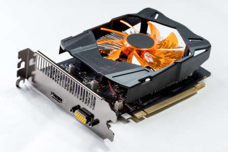 Analog and digital connector mounted in the graphics card. Old graphics card for PC. Light background.
