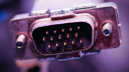 Simple laptop computer VGA video output connector, monitor connection port object macro, detail extreme closeup, frontal shot, nobody. Old legacy video outputs, obsolete dated retro technology concept