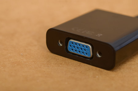 Close-Up of a Black VGA Connector with 15-Pin D-Sub Port on Brown Background