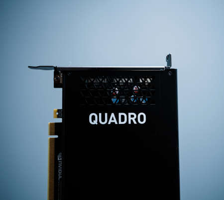 Paris, France - Sep 30, 2019: Square image of new Professional Nvidia Quadro P4000 GPU video card used in professional workstations - blue technology background