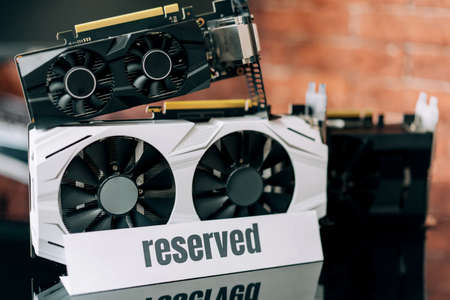 The video cards are on the table in a row one after the other. A component part of a computer for cryptocurrency mining and games. Near the inscription reserved.
