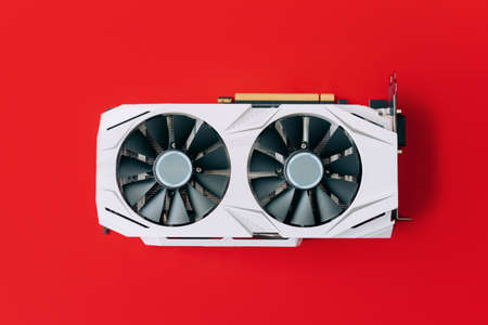 White graphics card with two black fans is located in the middle of red background. Trending computer peripherals.