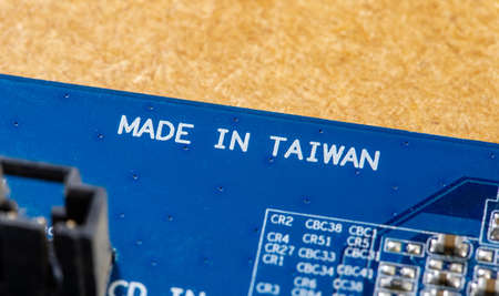 Made in Taiwan label, electronics, desktop PC components and parts, electronic device, appliance manufactured in Taiwan, object closeup, detail, nobody, no people, national production, manufacturing